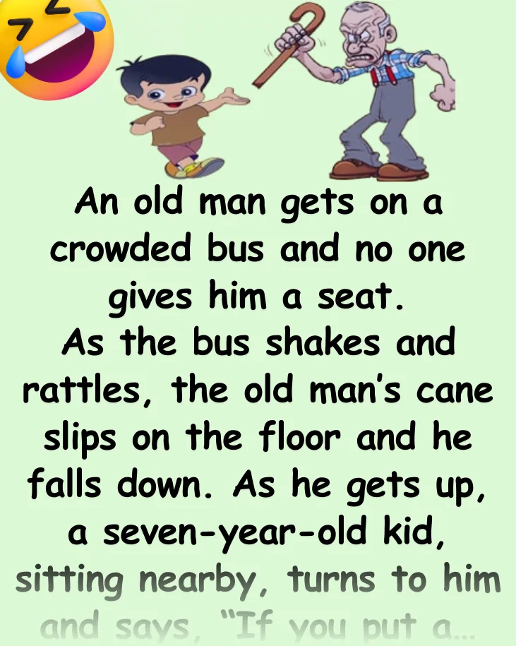An old man gets on a crowded bus and no one gives him a seat. As the bus shakes and rattles, the old man’s cane slips on the floor and he falls down.As he gets up, a seven-year-old kid, sitting nearby, turns to him and says, If you put a little rubber thingy on the end of your stick, it wouldn’t slip.” The old man snaps back, Well, if your daddy did the same thing seven years ago, I would have a seat today!”