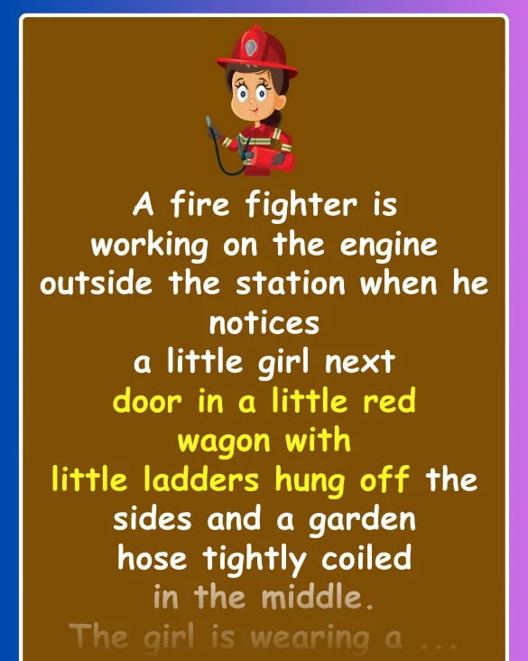 A firefighter is working outside the station when he notices a little girl pulling a red wagon with ladders and a garden hose, while her dog and cat are pulling it. She’s wearing a firefighter’s helmet, and the firefighter admires her setup, saying it’s a nice fire truck. Upon closer inspection, he sees that the girl has tied the wagon to the dog’s collar and the cat’s testicles. He suggests that she tie the rope around the cat’s collar to make the wagon go faster. The girl thoughtfully agrees, acknowledging he’s probably right.