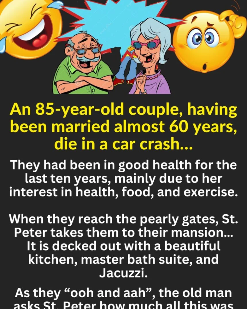 An 85-year-old couple, married for almost 60 years, tragically dies in a car crash. In heaven, St. Peter shows them to their mansion, which is beautifully furnished with a luxurious kitchen, master bath, and Jacuzzi. The old man asks how much it costs, and St. Peter replies, “It’s free, this is Heaven.” They are then taken to a championship golf course with free access every day, and a lavish buffet offering cuisines from around the world. When the old man inquires about low-fat options, St. Peter reassures him that in Heaven, they can eat as much as they like, without worrying about cholesterol or fat. The joke emphasizes the idea of limitless, worry-free enjoyment in the afterlife.