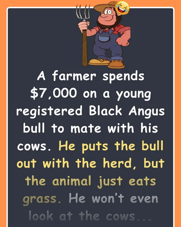 A farmer buys a young registered Black Angus bull for $7,000 to mate with his cows, but the bull refuses to engage with them, spending its time eating grass instead. Feeling frustrated, the farmer calls a vet, who examines the bull and finds it healthy but possibly too young to mate. The vet provides the farmer with pills to give the bull daily, which help stimulate its mating instincts. Soon after, the bull begins mating with the cows, even breaking through the fence to breed with the neighbor’s cows. When asked what the vet prescribed, the farmer admits he doesn’t know the exact contents but mentions the pills taste like peppermint and they work effectively.