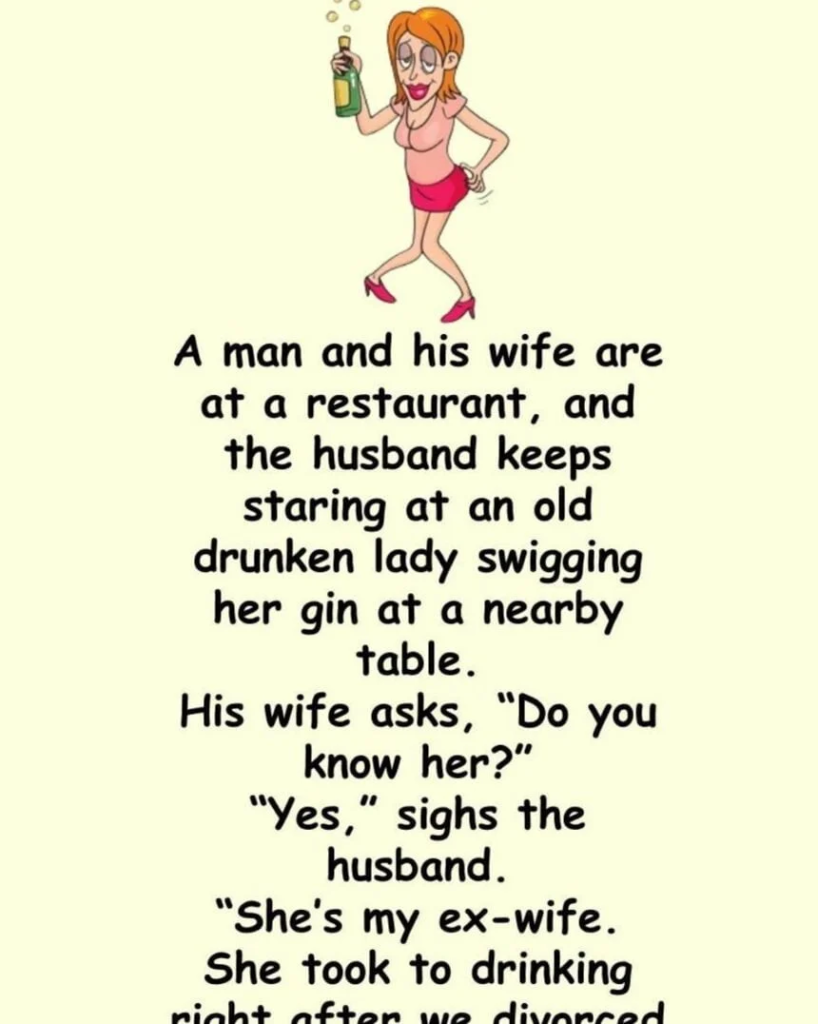 A husband and wife are dining at a restaurant when the husband keeps staring at a drunken woman drinking gin at a nearby table. The wife asks if he knows her, and the husband replies that she is his ex-wife, who turned to drinking after their divorce seven years ago and has been unable to stay sober since. The wife responds with disbelief, commenting, “My God! Who would think a person could go on celebrating that long?”