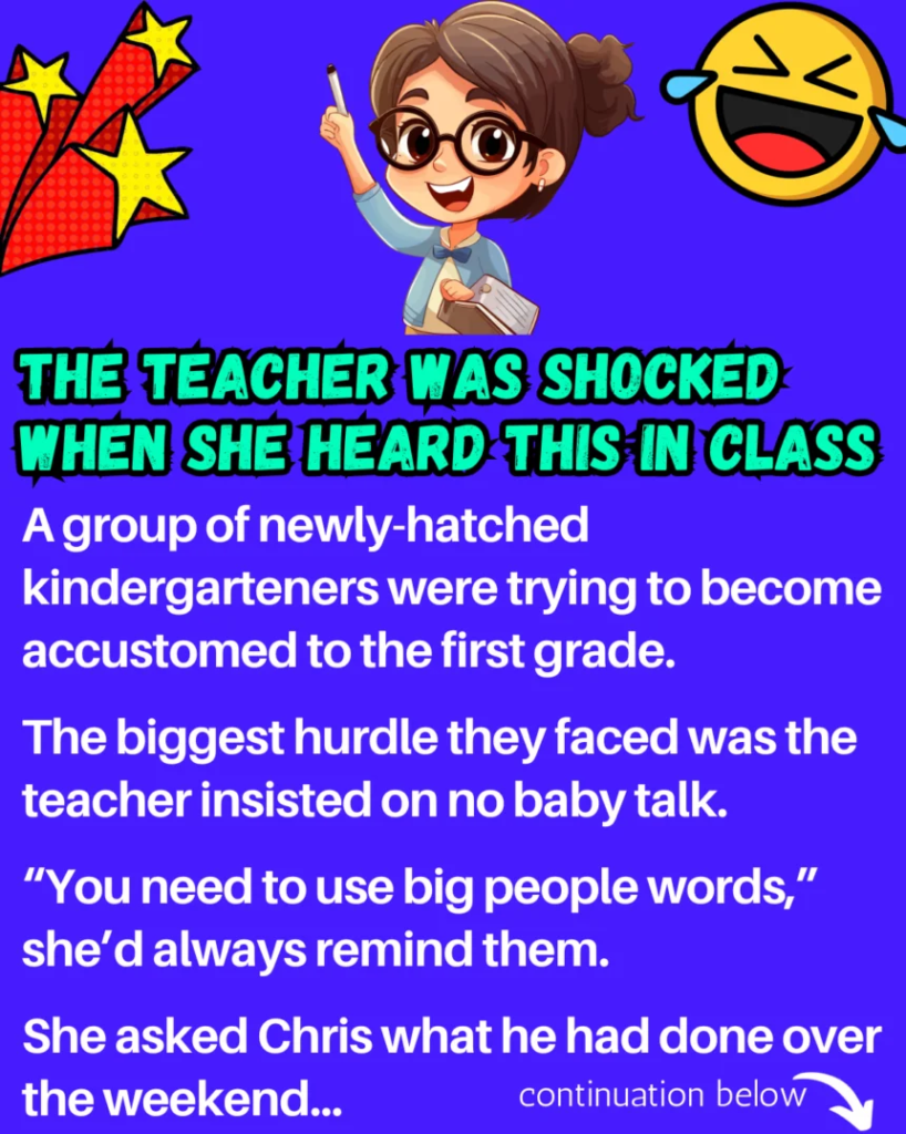 In the story, a teacher is working with a group of kindergarteners transitioning into first grade. She insists they use “big people words” instead of baby talk. When she asks the students about their weekend activities, she corrects them for using childish terms. Chris says he visited his “Nana,” but the teacher corrects him to say “grandmother.” Mitchell talks about riding a “choo-choo,” which the teacher corrects to “train.” Finally, when Bobby shares that he read a book, he proudly says it was “Winnie the Shit,” which leaves the teacher shocked and amused.