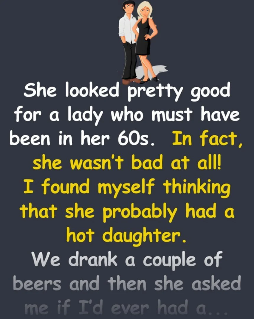 A woman in her 60s, looking surprisingly good for her age, shares a drink with a man. She eventually asks if he’s ever had a “Sportsman’s Double.” Curious, he asks what it is, and she leads him upstairs, calling out to her mom, suggesting something more than what he expected. The setup hints at an unexpected offer involving the woman’s daughter. The story teases a surprise twist, with the man unsure of what will happen next.