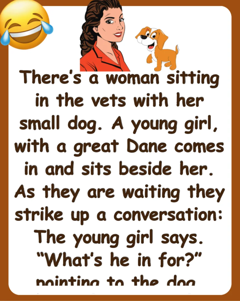 The joke in “The Vets” centers around a conversation between two women at a veterinary clinic. One, an older woman, is with her dog, who has a troubling habit of trying to mount her whenever she bends down. She shares that she’s there to have him neutered. The younger woman, sitting nearby with her Great Dane, asks about her dog’s issue, only to reveal that her dog has the same behavior. The older woman, thinking the young girl is there for the same reason, asks if she’s having her dog neutered as well. The young girl humorously responds, “Good God no. I just want his toenails clipped,” revealing the misunderstanding.
