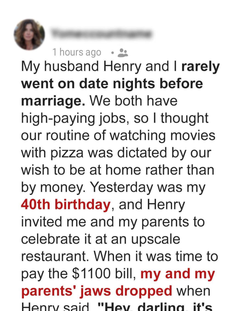 My name is Nora, and yesterday was my 40th birthday. My husband, Henry, invited me and my parents to an upscale restaurant to celebrate. It felt special until the $1,100 bill arrived, and Henry casually said, “Hey darling, it’s your birthday, so I thought you’d want to pay. I didn’t bring my wallet.”