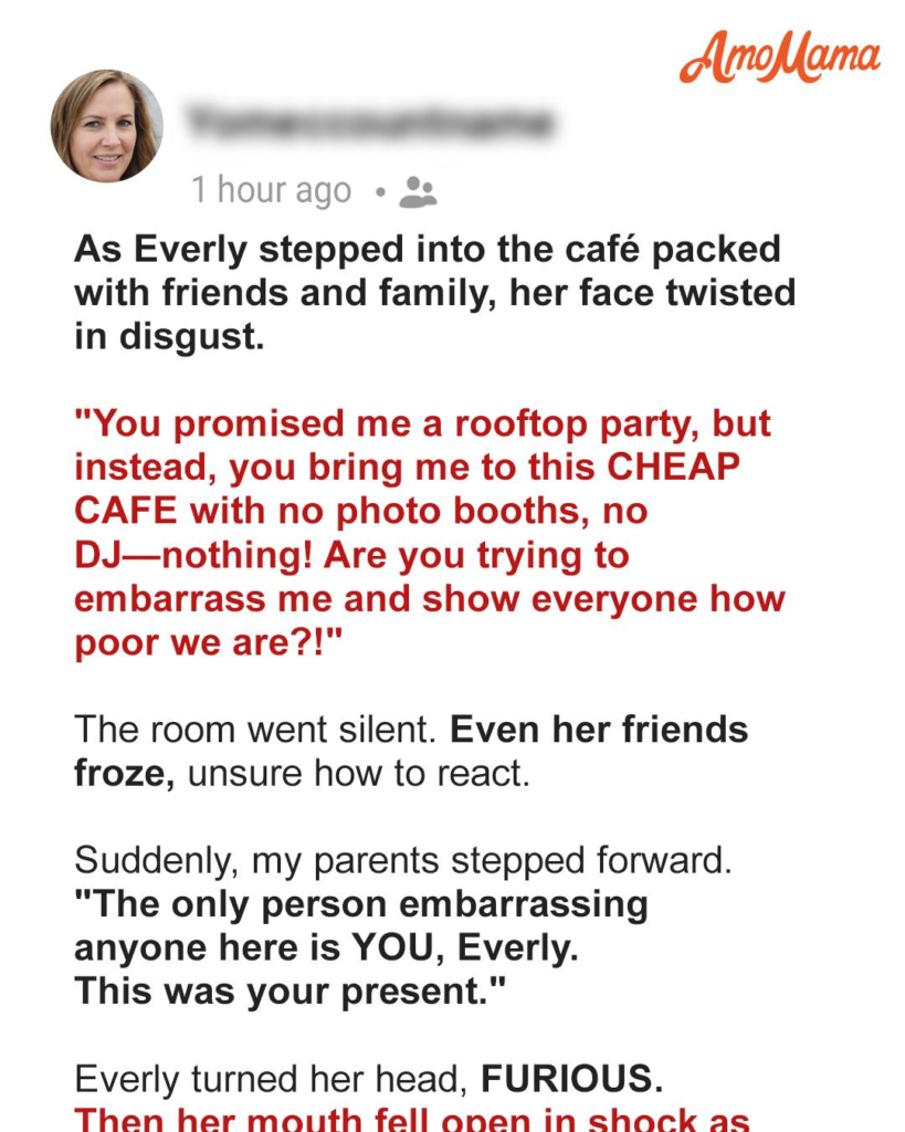 Everly’s Sweet 16 took an unexpected turn when she dismissed the café party her parents, Oscar and I, planned as “cheap” before discovering the lavish rooftop setup and surprise gift—a red convertible. Her hurtful outburst humiliated us and disrupted the event, leaving everyone disheartened.