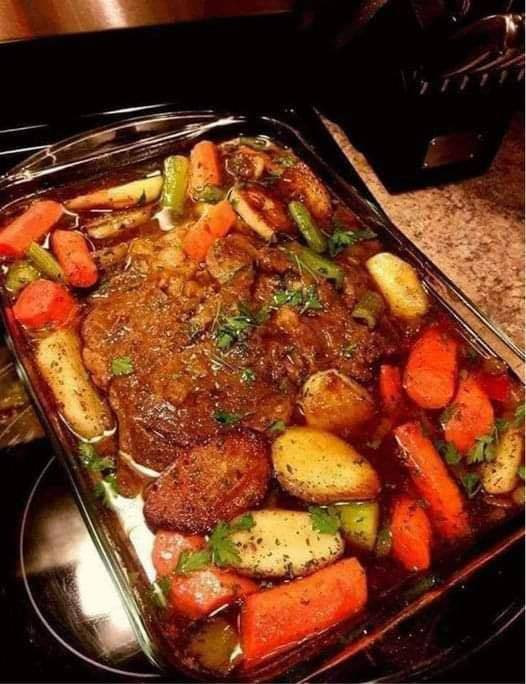 fry onion and add water, beef and all Ingridients except potatoes and carrots.