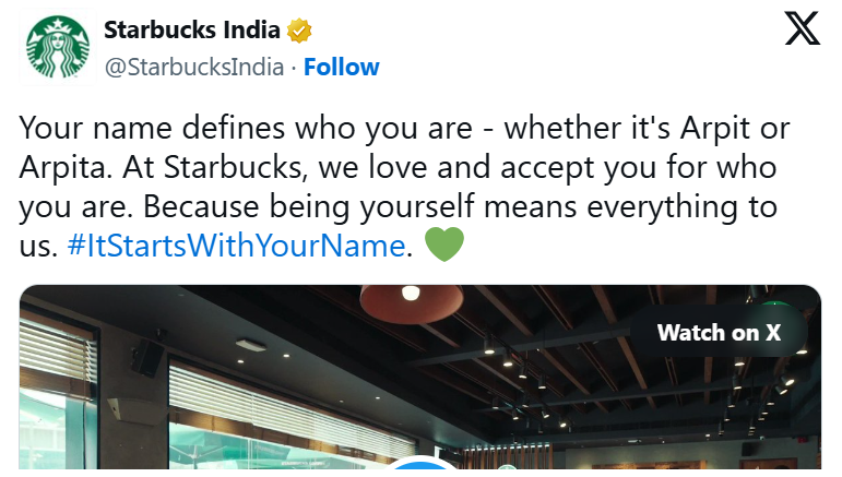 “Your name is a reflection of your true self, whether it’s Arpit or Arpita. At Starbucks, we celebrate and embrace your individuality, because being genuine is of utmost importance to us. #ItStartsWithYourName.”