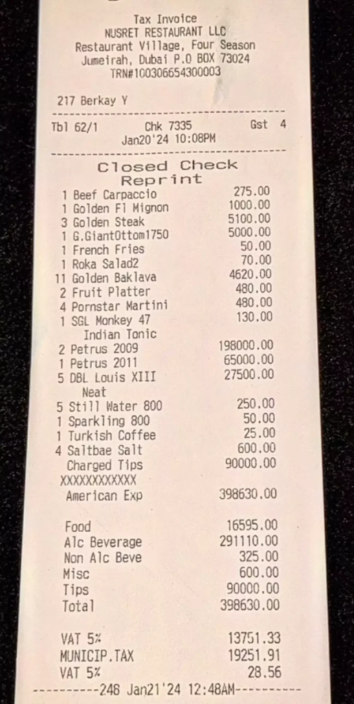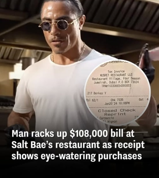 A customer at Salt Bae’s restaurant in Dubai racked up an unbelievable $108,000 bill for food and drinks. People are shocked by the receipt, which was shared by the famous cook himself. They don’t understand how someone could spend such a huge amount of money on breakfast.