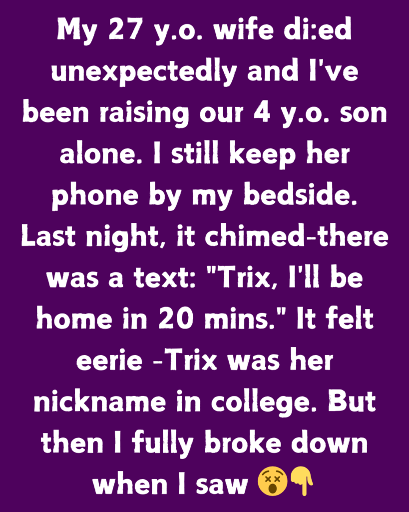 My 27 y.o. wife died unexpectedly and I’ve been raising our 4 y.o. son alone. I still keep her phone by my bedside. Last night, it chimed—there was a text: ’’Trix, I’ll be home in 20 mins.’’ It felt eerie —Trix was her nickname in college. But then I fully broke down when I saw a reply being typed back. It said, “I miss my daughter. I can’t stop thinking about her. I will not wait any longer. We should finalize our plan on how to bring her from her dad’s house tonight!