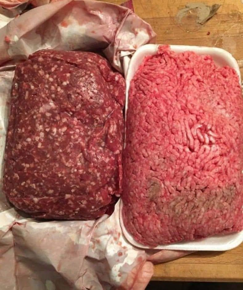 The store-bought beef on the right immediately catches the eye with its lighter, almost pinkish hue. This is not a mere coincidence; it is the result of the addition of various preservatives and additives, such as propyl gallate, which are used to extend the meat’s shelf life and maintain its appealing appearance. While these chemicals may achieve their intended purpose, they also mean that you, the consumer, are ingesting substances that are not naturally present in the meat.