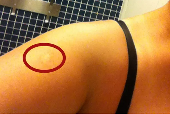 However, after 6 to 8 weeks, a bump appears that looks like a mosquito bite and develops into a lump. Later on, it opens up, leaks liquid, and turns into a sore, which eventually heals and becomes a permanent scar.