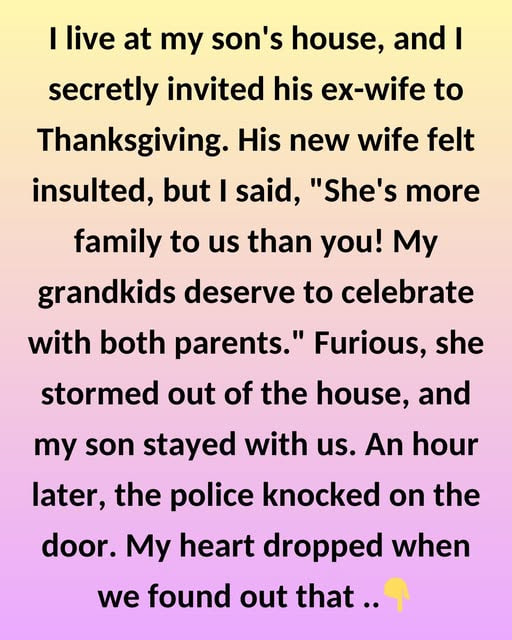 I live at my son’s house, and I secretly invited his ex-wife to Thanksgiving dinner. His new wife felt insulted, but I said, “She’s more family to us than you! My grandkids deserve to celebrate with both parents.” Furious, she stormed out of the house, and my son stayed with us.
