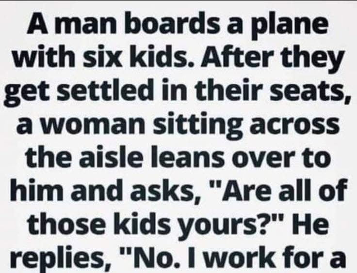 After they get settled in their seats, a woman sitting across the aisle leans over to him and asks,