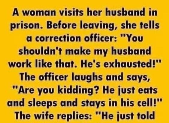 The officer laughs and says, “Are you kidding? He just eats and sleeps and stays in his cell!”
