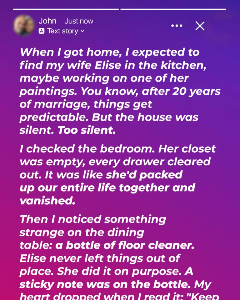 When I came home, I expected to find my wife, Elise, in the kitchen or painting, but the house was eerily quiet. Her closet was empty, and the drawers had been cleared out. On the dining table was a bottle of floor cleaner with a note that read, “Keep it shiny for the next one! Goodbye!”