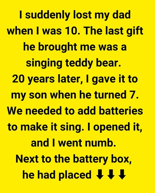 I suddenly lost my dad when I was 10. The last gift he brought me was a singing teddy bear. I kept it, and 20 years later, I gave it to my son when he turned 7. We needed to add batteries to make it sing again. I opened it, and my entire body went numb when I discovered a very unexpected sight….