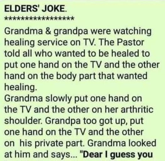 Grandma & grandpa were watching healing service on TV. The Pastor told all who wanted to be healed to put one hand on the TV and the other hand on the body part that wanted healing.