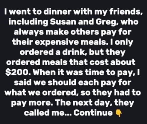 For some background, 2 people from the group, Susan and Greg, are just absolute leeches.Going out for lunch? Expect them to order the most expensive on the menu, then feed you some sob story about their finances, and then dumb half the bill on you. Last weekend, Dan, one of the people from the group, told me about a casual dinner. I told him how if Susan or Greg were there I wouldn’t be able to come.He tells me that they would be there but I should just put my opinions aside and come just once. This is kind of where I might be a bad guy. I agreed with him and told him I would be there. I show up and we all get to talking.Everyone began putting in their orders, most of them spent about $40. There were only about 6 people there. When it gets to Susan and Greg, they both order expensive dishes, around $200. When it was my turn to order, everyone looked at me, but I just pick up the menu and point to the $4 drink and sent the waiter away. Dan asked why I hadn’t ordered anything and all I said was that I lost my appetite. The other 2 friends got up as well to cancel their orders and just have drinks.After the main courses came out, I saw Susan and Greg picking at their food. The waiter then brings over the check. Greg then grabs the waiter and asks him to split the check 6 ways. I stand up and correct him saying the check was to be split 3 ways. Greg looks at me confused and asks why since we “always” split the bill.I reminded him that the 3 of us had not eaten any food so we would just be paying for our drinks. So basically at the end of the night, Dan, who probably only ate around $50 worth of food, was stuck with a $146.98 check at the end. (Yes, I remember the exact number.) I swear I saw his jaw drop when he picked that receipt up.I slid a $10 towards the check, said goodbye everyone, and walked out. The next morning, I found my phone full of texts from Greg and Susan telling me I was a bad guy for not ordering any food and forcing them to pay more than they had accounted for.I honestly laughed because the steaks alone were more than what they had paid but to each their own right? I also got a lot of messages from Dan saying that I could have just not came instead of pulling that stunt and getting him stuck with an outrageous bill.
