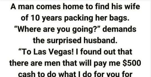 Once upon a time, there was a man who came home to find his wife of 10 years packing her bags. Confusion washed over his face as he asked, “Where are you going?” Little did he know, his wife had a surprising revelation. She boldly declared, “To Las Vegas! I found out that there are men who are willing to pay $500 cash for the very things I do for you, for free!”
