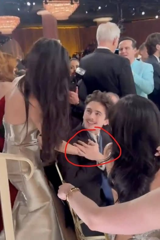 Kylie Jenner is sitting behind her and looking at the actor. It is clear that Jenner wants to talk to her, but her body is blocking her.