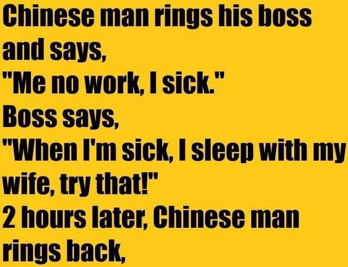Chinese man rings his boss and says, “Me no work, I sick.” Boss says, “When I’m sick, I sleep with my wife,