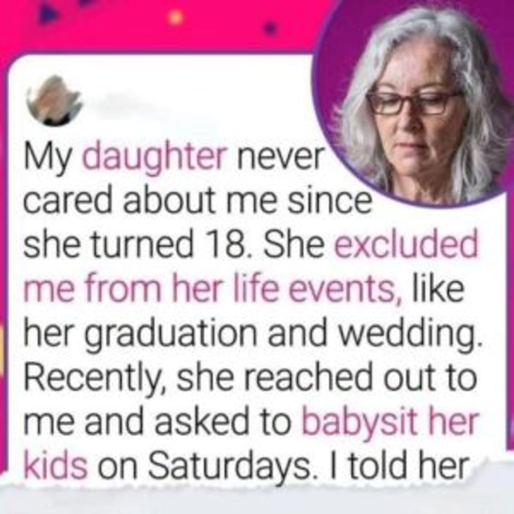It is a great advantage to have our relatives look after our children while we are busy with our jobs, especially when they do not charge us anything. However, is it fair to expect this help from our parents after all the conflicts we had with them?New message From: Rachel Subject: My daughter cut off all ties with me but then appeared and asked to babysit her kids My daughter Amy never cared about me since she turned 18. She excluded me from her life events, like her graduation, her engagement, and so on. So we barely talk to each other. She has two boys now and she recently reached out to me.I was surprised and we had a conversation. After some time, Amy started to whine about how hard it was to raise her kids without any help. She asked me to babysit them on Saturdays and be a good grandparent. I told her that she had destroyed our bond a long time ago and I can’t take care of her kids now. She called me selfish and blocked me everywhere. Was I wrong to refuse to help my daughter with the kids after everything that happened between us? I would appreciate your input and your helpful advice. Thank you for reaching out and sharing your concerns about the situation with your daughter. We at understand how unsettling and challenging this situation must be for you. Based on your description, here are some practical and realistic pieces of advice to help you navigate through this situation: • Know your rights.