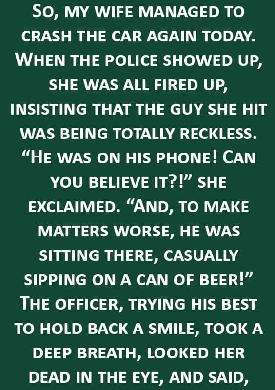 My wife had another car mishap today. When the police arrived, she was all riled up, insisting the man she hit was completely reckless.
