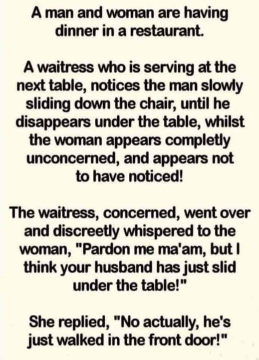 Upon completing the order, the waitress approached the table and addressed the woman, saying, “Excuse me, madam, but I believe your husband just slipped beneath the table.”