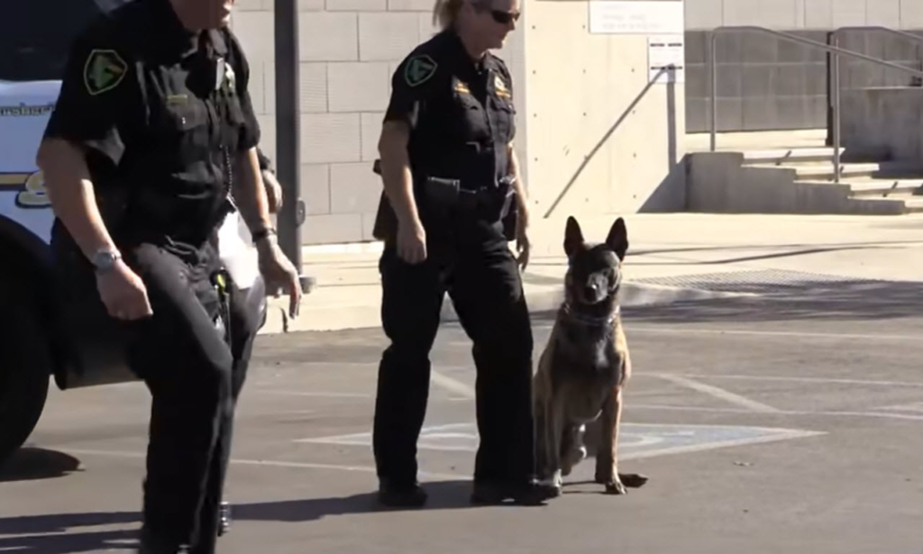 The amazing thing is that the police dog never breaks his position. The dog is watching carefully, sitting down at first and then standing up to check things out as much as possible.