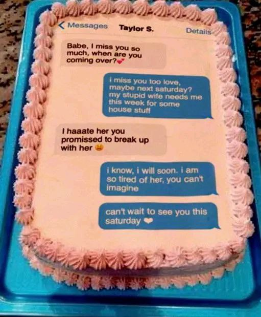 On my husband’s birthday, I heard the doorbell ring and rushed to the door, only to be greeted with a cake delivery. I hadn’t ordered anything, but my hands were so full with preparations for the party that I just signed up for the delivery and popped the cake in the fridge, thinking it might be a surprise present from someone. Well, it turns out it was hardly a present, but a surprise for sure. As guests arrived and my husband was having fun with his family and friends, I took the cake out of the fridge and opened that box.I almost dropped the cake when I saw a photo cake with a screenshot of a conversation. As I read it, my stomach grew sick. However, I was not the one to go down in silence
