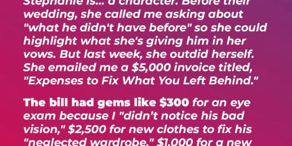 After our amicable split, Matt remarried quickly. Stephanie, a self-proclaimed “queen,” emailed me a detailed invoice totaling over $5,000, blaming me for Matt’s “emotional damage” and claiming she’d “invested in fixing him.”