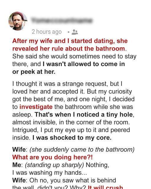 Realizing the situation, Louise confronted me, and it was clear there was more to the mysterious bathroom than I could have ever imagined. Now, let me take you on a journey to uncover the truth behind my wife’s guarded secret.