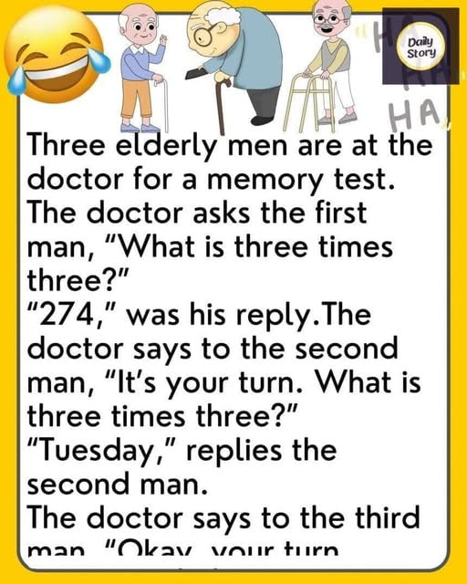 Three elderly men visit the doctor for a memory test. The doctor asks the first man, “What is three times three?”