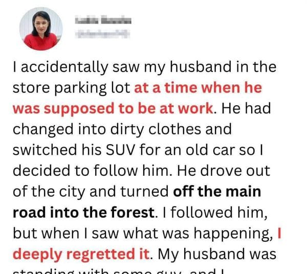 She then parked her car, grabbed the shopping bag from the backseat, and exited the vehicle. But as she navigated through the parked cars, an SUV caught her attention. Was that her husband’s? According to the rear bump it was. But where was he, she wondered. At that moment, the thought of him staying late at work during the past period, the secret phone calls, and his rather odd behavior started flooding her mind.