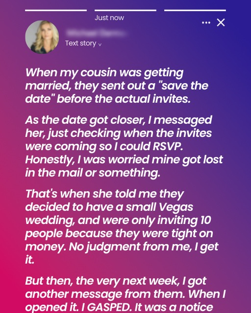 Months later, she sent out “save the date” cards. But as the date approached, I never received an invitation. When I asked, Lisa said they were having a tiny Vegas wedding—just ten people. I was disappointed but understood.