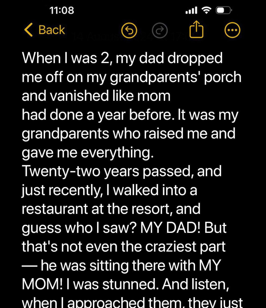 22 years after my dad abandoned me on my grandparents’ doorstep, I ran into him at a restaurant, dining with my mom. The shock of seeing them, whom I thought I’d lost forever, sent me into a whirlwind of emotions. Confronting them only tangled me deeper in their web of lies.