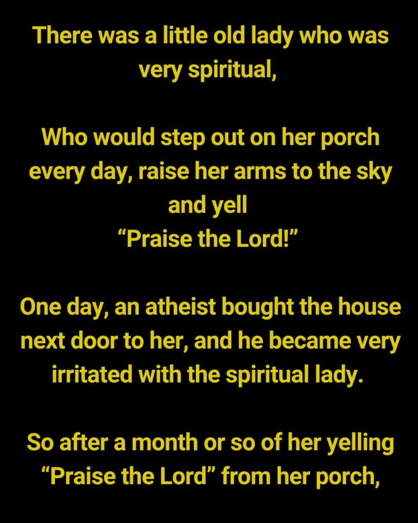 One day, an atheist bought the house next door to her, and he became very irritated with the spiritual lady.