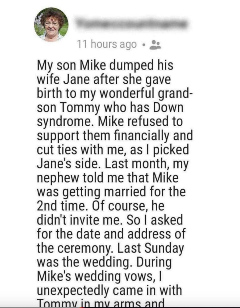 was at the wedding of my son Mike because I was determined to talk to him about how he was being bad to his son Tommy and his ex-wife Jane.
