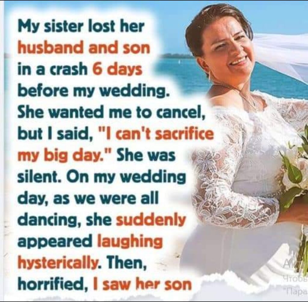 My sister lost her husband and 8-year-old son in a crash six days before my wedding. She wanted me to cancel, but I said, “I cannot sacrifice my day. We have already paid for everything.” She was silent. On the big day, as we were all dancing, my sister appeared in the crowd, laughing hysterically. Then all of a sudden, we hear a massive sound as all the lights in the party venue switched off at once, and the music abruptly stopped. Horrified, I saw her son and husband’s images appear on the large projection wall where our wedding photos were displayed. In that moment, I realized she had orchestrated a plan to ruin my special day.My sister then got up on stage and took the microphone, addressing me by saying, “You’re up here dancing and partying while your little nephew died less than a week ago. Shame on you!” Before leaving the stage, she added, “When you have kids of your own, I will treat them with the same indifference you treated mine!” Everyone was silent after that, and the guests started leaving shortly after. My day was totally ruined. Was I to blame?Leah