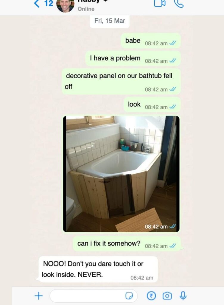 Emily is stunned when an innocent text to her husband about repairing a decorative bathtub panel sparks a panicked response. What could he be hiding in there? Emily just has to find out.
