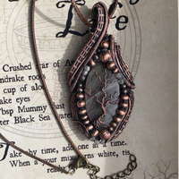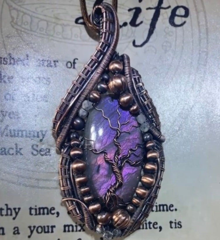 I have encased this stunning multi-fire labradorite in bare copper wire with striped weaves, adorned with copper beads and blue rainbow crystal-etched Czech glass fire polished beads for embellishment and then woven a bare tree of life (Crann Bethadh) on the front, The tree of life represents the afterlife, and connection between the earth and heaven.
