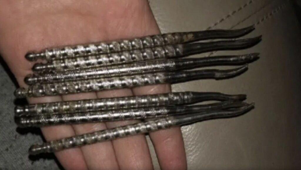 The metal sticks are actually nutcrackers! Likely from the 1940’s or 1950’s, this type of nutcracker would be used to dig the actual nut out of a shell.