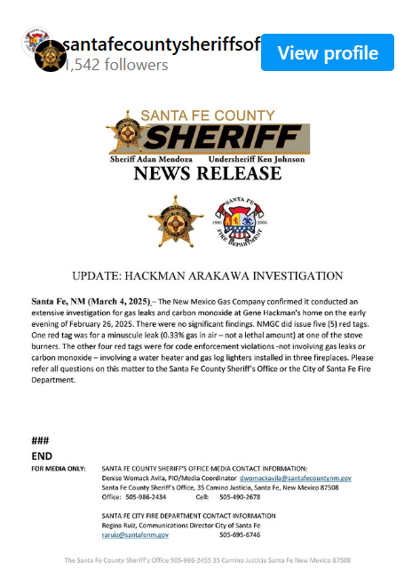 As of now, it was reported that the New Mexico Gas Company concluded its inspection at the home where Gene Hackman and Arakawa resided located at 1425 Old Sunset Trail. The company said in a statement that they had done thorough inspection of the residence for both gas leak and any presence of carbon monoxide and shared their findings with the authorities on March 5.