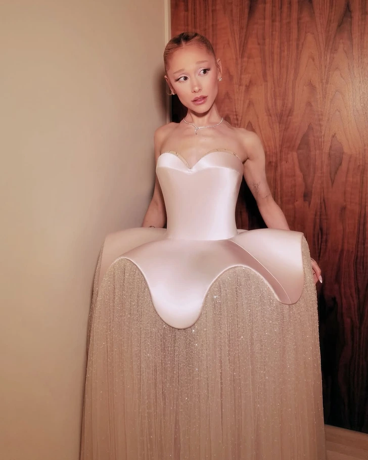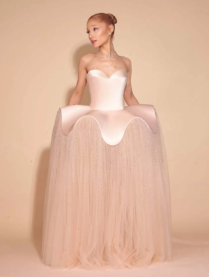 Ariana Grande turned heads at the 2025 Academy Awards with her bold pale pink Schiaparelli gown.