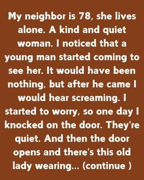 At the age of 78, my neighbor lives alone. A woman of peace and kindness. I noticed that she was being visited by a young man. I heard screams when he got there, but it would have been nothing.
