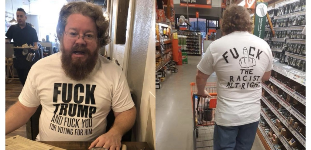 The front of Ternay’s shirt read “FUCK TRUMP AND FUCK YOU FOR VOTING FOR HIM” while the back read “FUCK THE RACIST ALT-RIGHT.”