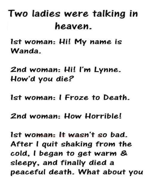 First woman: Shame you didn’t think to check the freezer… we’d both still be here.