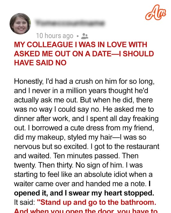 I had admired Daniel for years, so when he invited me to dinner, I eagerly accepted. But at the restaurant, he never showed. Instead, a waiter handed me a note instructing me to meet him in the bathroom. Suspicious but hopeful, I went.