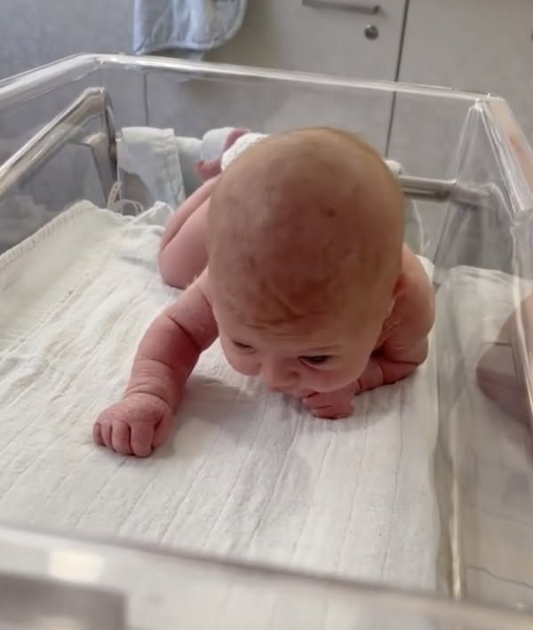 In the clip, baby Nyilah can be seen propping herself up on her arms, supporting her head, and crawling forward—a milestone that typically doesn’t happen until babies are six to nine months old, according to Healthline.